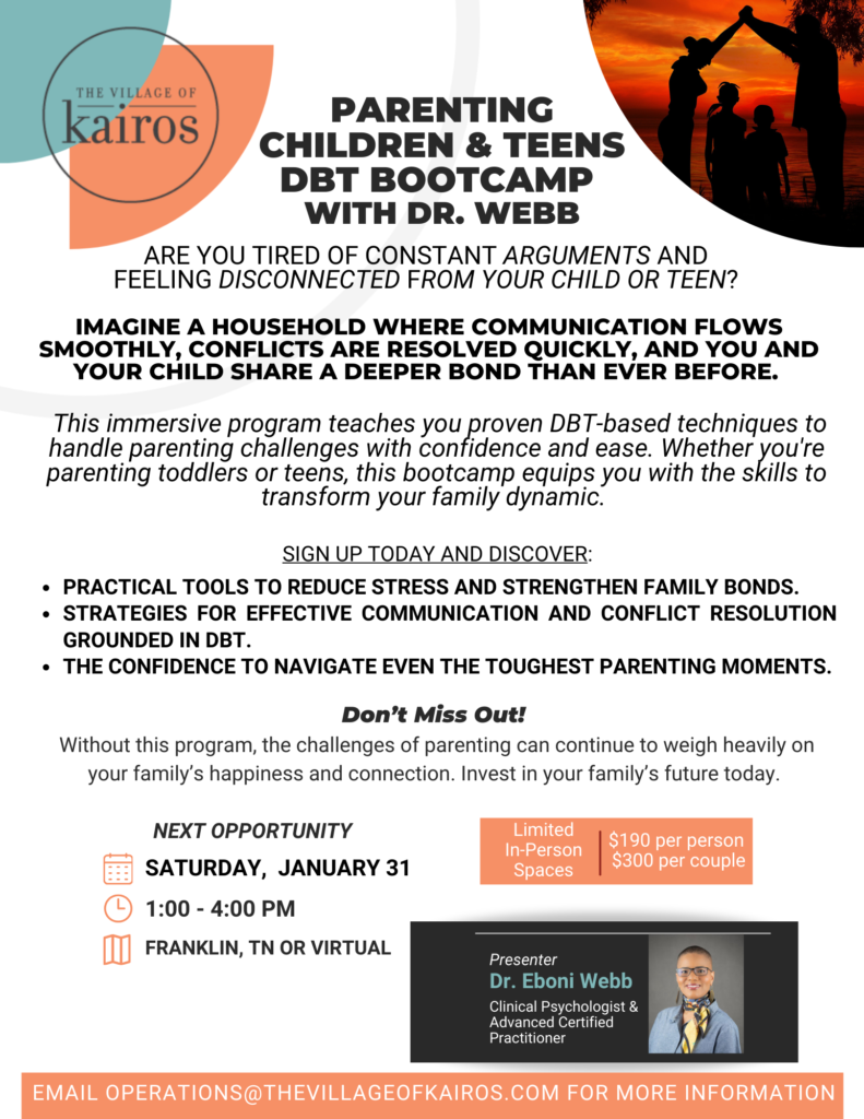 Embark on a transformative experience with our exclusive Parent DBT Bootcamp. This intensive event, expertly led by Dr. Eboni Webb, is designed for parents of adolescents facing mental health challenges.