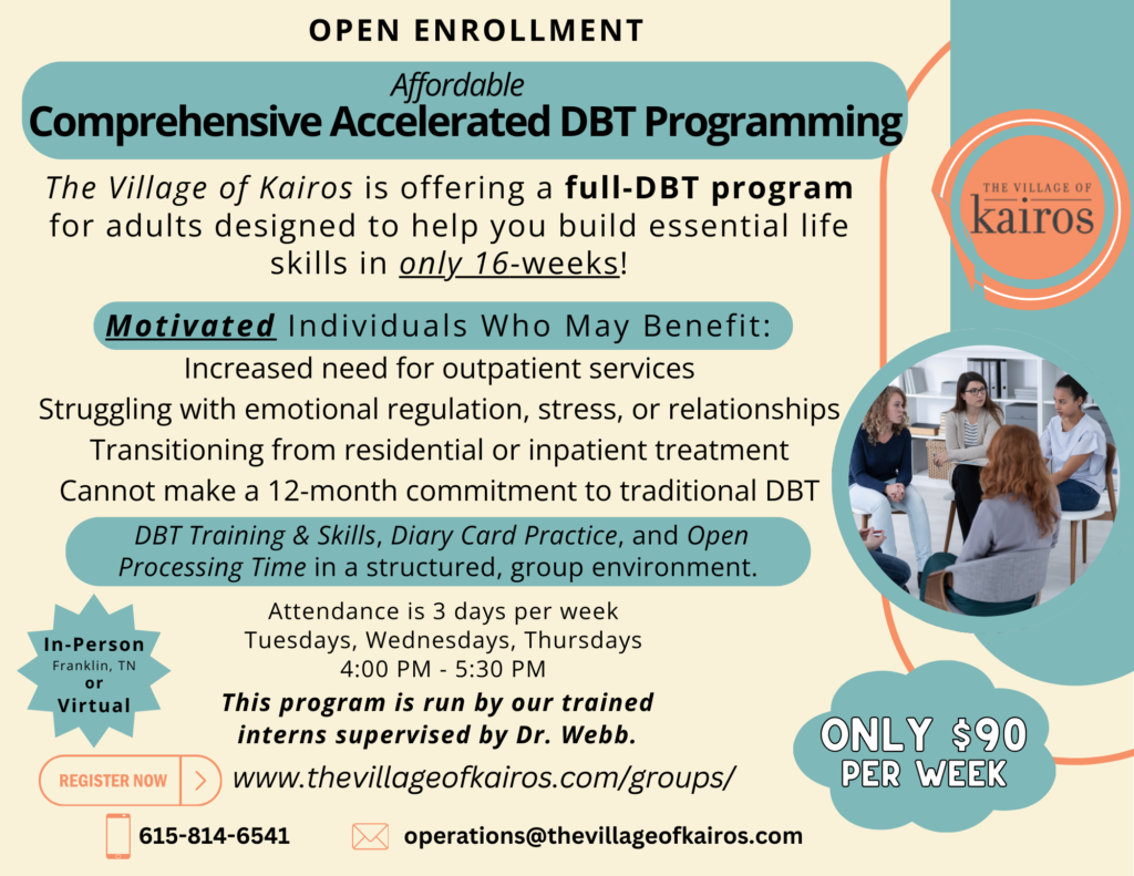 Facilitated by masters-level interns under the direct supervision of Dr. Eboni Webb, this program offers a high level of clinical quality while remaining accessible and affordable. The goal is to support each participant in learning, applying, and internalizing DBT skills in a way that fosters lasting change and emotional resilience.